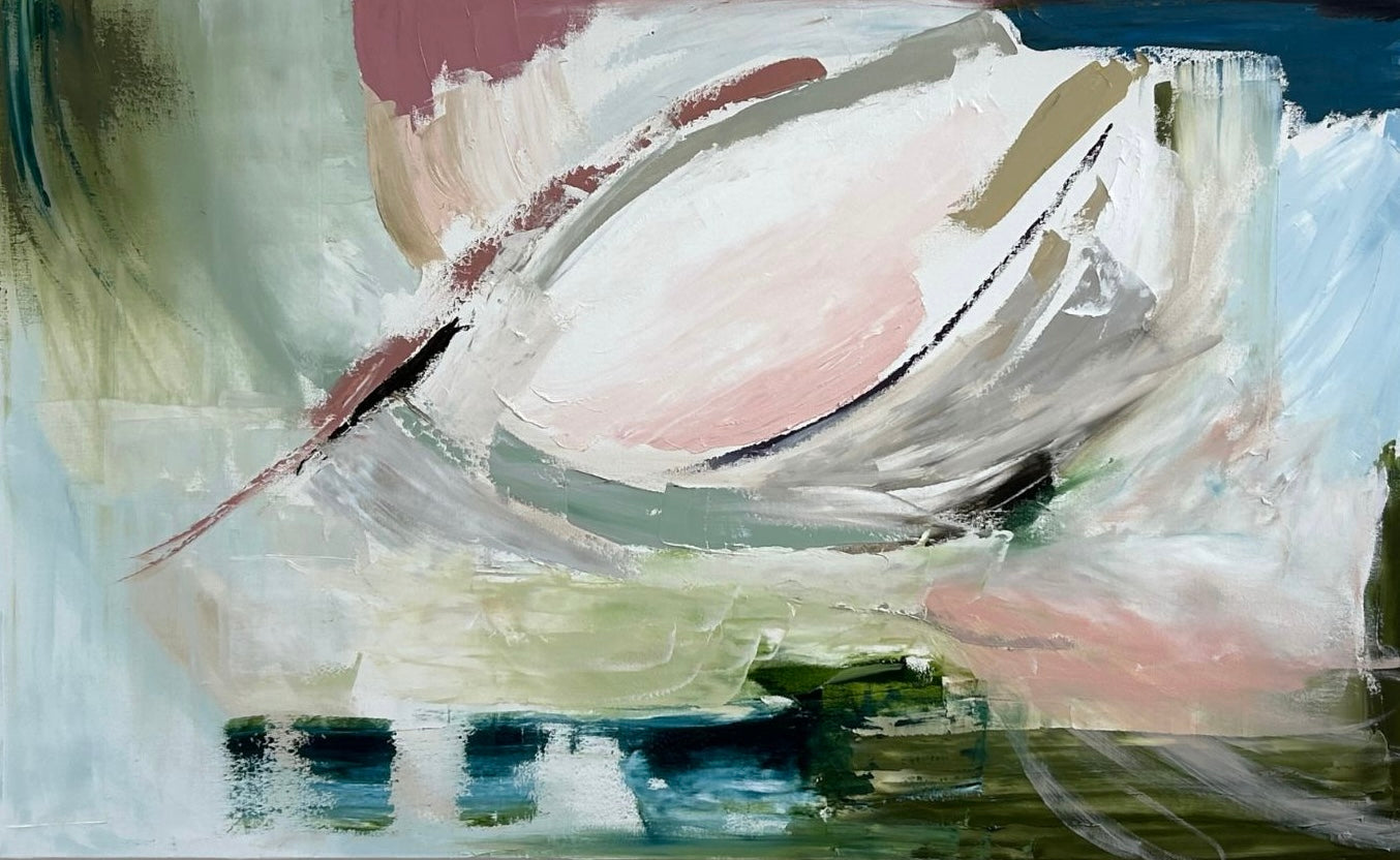 A Statement Was Made draws the eye through its sophisticated vivid composition. This 30 × 48 inch oil painting weaves burgundy, black, white, taupe, blues, greens, and pinks across the canvas in a carefully balanced arrangement.