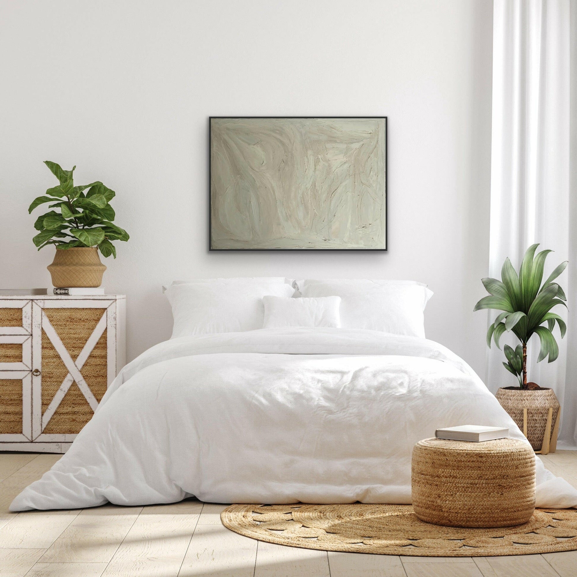 Bring elegance and dimension to any room with this large 30x40 inch canvas. Featuring an original oil painting with a beautiful mix of warm and cool shades of white, this minimalist design will add a touch of sophistication to your walls. Hang it horizontally or vertically, the light taupe colored sides will complement any decor. This piece is filled with texture, adding depth and interest to your space. It comes ready to hang with attached wiring and my signature on the back. Complimentary worldwide shipping.