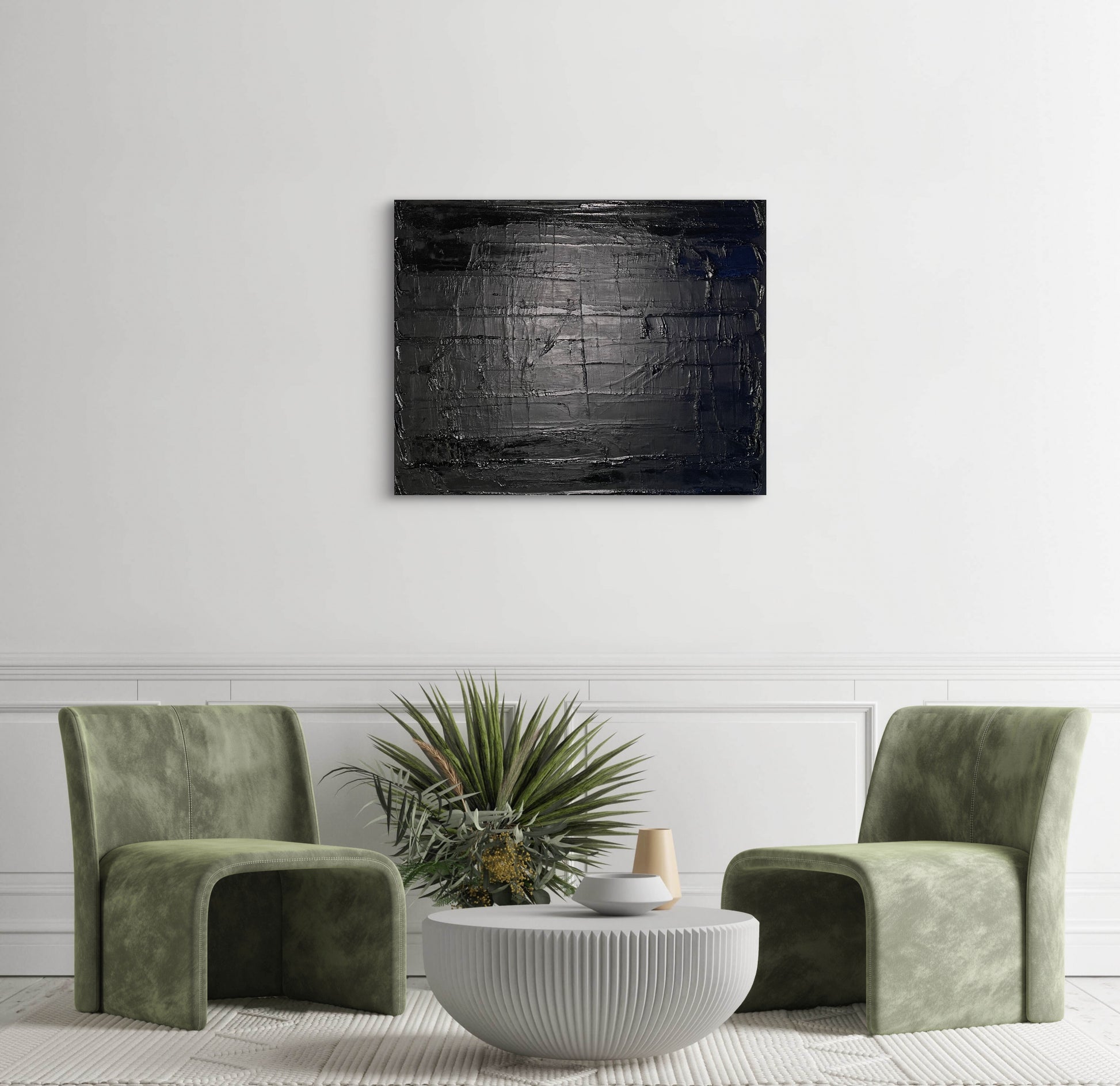 Measuring 24x30 inches, this unique piece offers flexibility in how it’s displayed, whether hung horizontally or vertically. Its sleek, modern design and powerful use of black make it a standout piece for those seeking a refined, contemporary touch. The piece exudes sophistication, making it ideal for luxury homes, upscale offices, or high-end commercial spaces.