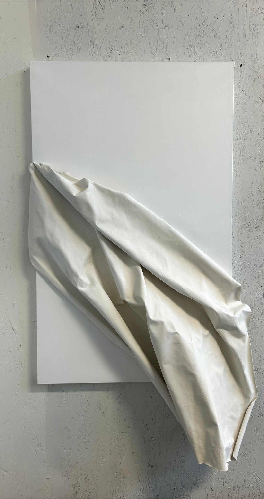 Created on recycled cotton canvas, "Pippa" measures 30x48 inches, with an additional 8-inch overhang at the bottom, giving it an impressive presence. The canvas is a soft satin neutral white, the perfect contrast to the three-dimensional plaster elements that mirror the natural beige tones of the material. Raw seams and visible brushstrokes add texture and authenticity, making it a one-of-a-kind piece. The sides of the canvas are 1.5 inches deep, adding an extra layer of dimension that creates a sophisticated visual impact, whether displayed in a private residence or an upscale commercial space.